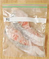 冷凍のエビを買って来た時はそのままジッパー式バックに。生のエビは霜がつきやすいので、バックに水をいっぱいに張り、水ごと冷凍すると、エビが氷の中に閉じ込められて、鮮度を保てます。